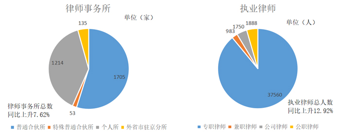 律师事务所总数3107家,同比上升7.62%。其中:普通合伙所1705家、特殊普通合伙所53家、个人所1214家、外省市驻京分所135家。
