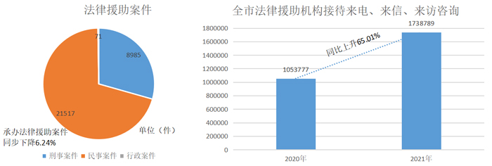 全市法律援助机构接待来电、来信、来访咨询共1738789人次,同比上升65.01%。